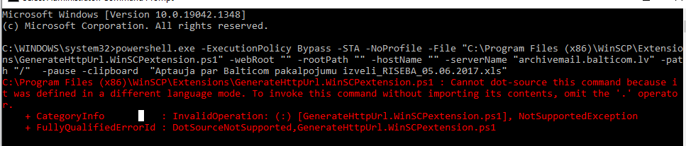 C:\Program Files (x86)\WinSCP\Extensions\GenerateHttpUrl.WinSCPextension.ps1 : Cannot dot-source this command because it was defined in a different language mode. To invoke this command without importing its contents, omit the '.' operator.