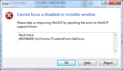 This is a Windows 10 install, happens only now after I updated to the latest version. WinSCP is just opened and connected into a session. Still have full functionality after hitting ok throuhg the error