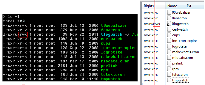 rwxr-xrw- is to take advantage of the monospaced column layout of the terminal, enabling quick eyeball scans of the rights data. This breaks in WinSCP which uses poly-spaced fonts.