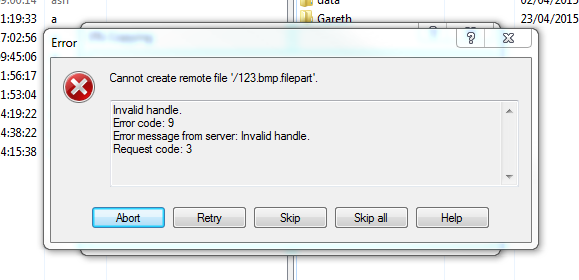 I am getting an error of 'Invalid Handle' when trying to transfer a file to an SFTP using the WinSCP client directly, or through an SSIS package.