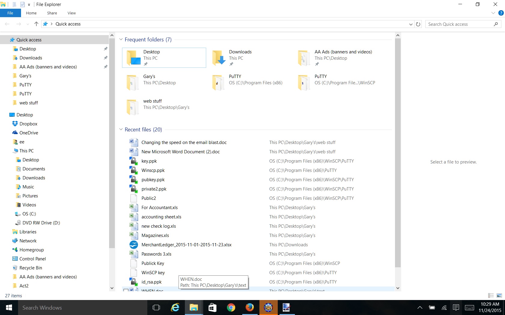 I generated and saved the keys. When I try to authenticate my private key file Winscp does not see the key file I saved. I can't even see the file when I look at the folder I saved then in with file explorer. Not even looking with Window Powershell. When I open up the file explorer icon on the bar at the bottom of the desktop I do see them under recent files. But that is the only way I can see them. Although Putty does see them. But I need to load them for Winscp.
