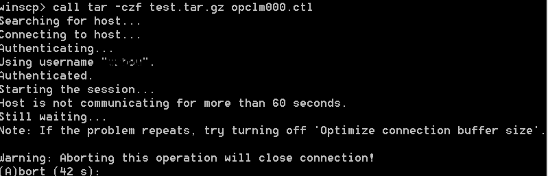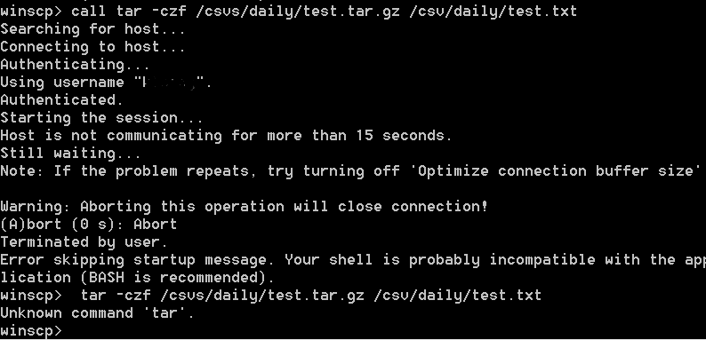 I am using Winscp command line to zip a file and I got a “host is not communicating for more than 15 seconds” error. Here is the command that I type in “call tar -czf /csvs/daily/test.tar.gz /csv/daily/test.txt” The server is a Linux server. What I am trying to do is zip up a whole bunch of files and download it. Please help