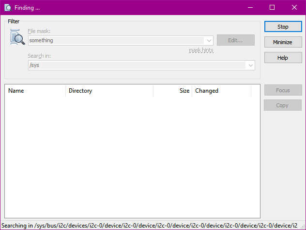 using the search function (find files) , it gets stuck in an endless loop adding the path to the search path in an infinite loop, like the picture shows, notice the path at bottom of the window.