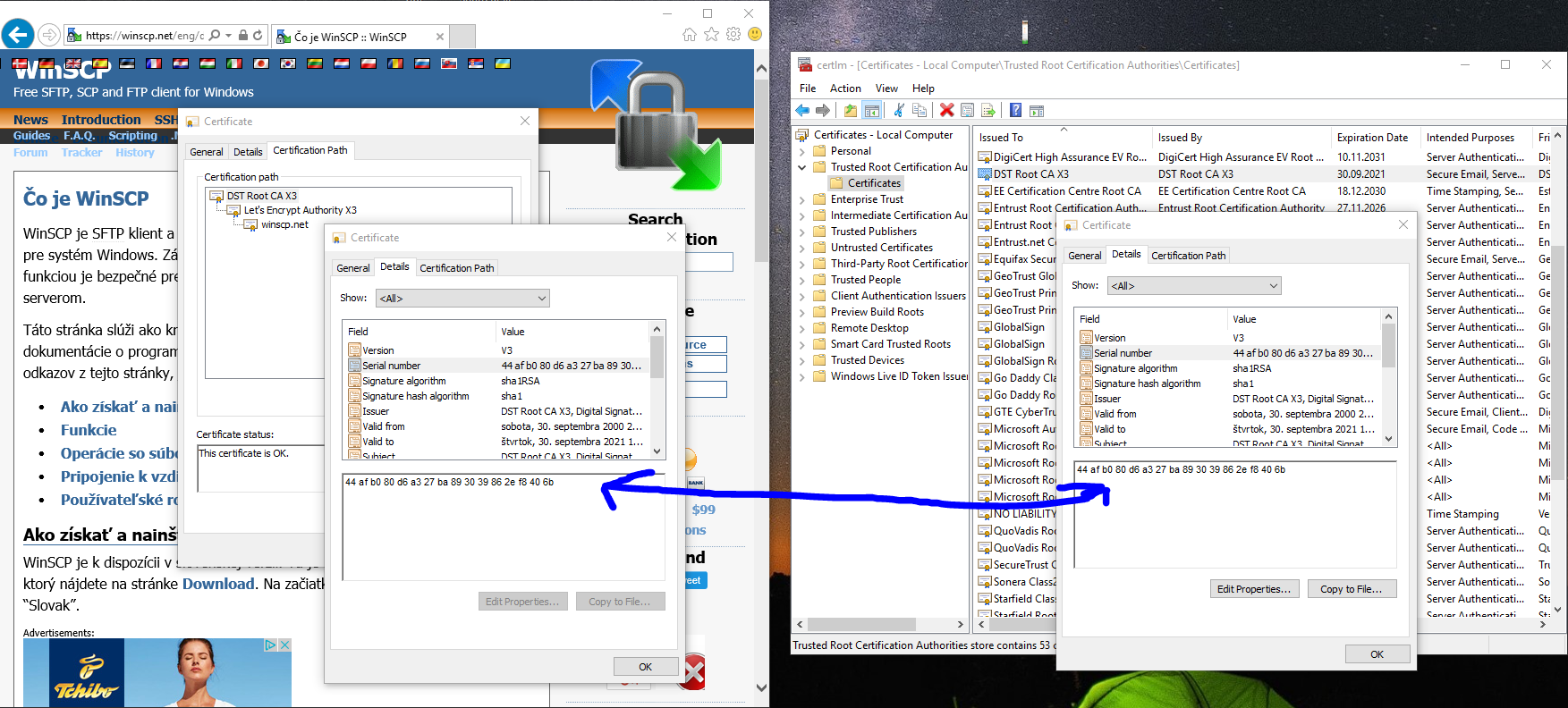 I tried to update WinSCP 5.8.2 beta (build 6284) via "Check For Updates" but winscp.net has new Let's Encrypt certificate, so, it's failed because of certification trust. (look attachment)