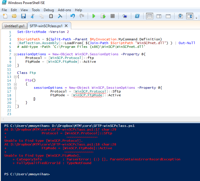 PS D:\> D:\testFTP.ps1 At D:\testFTP.ps1:14 char:29 + Protocol = [WinSCP.Protocol]::Sftp + ~~~~~~~~~~~~~~~ Unable to find type [WinSCP.Protocol]. At D:\testFTP.ps1:15 char:28 + FtpMode = [WinSCP.FtpMode]::Active + ~~~~~~~~~~~~~~ Unable to find type [WinSCP.FtpMode]. + CategoryInfo : ParserError: (:) [], ParentContainsErrorRecordException + FullyQualifiedErrorId : TypeNotFound