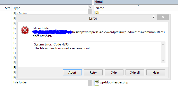 I've been using your software on several machines without issue for years. Suddenly, on one, I keep getting the error "The file or directory is not a reparse point". When I upload files, like a Wordpress install, it frequently pops up, and there's no way to automatically "Retry: the process. Therefore, I have to sit at my computer for 30 minutes continually pressing the "Retry" button. If I miss and hit "Abort", I have to start all over again.