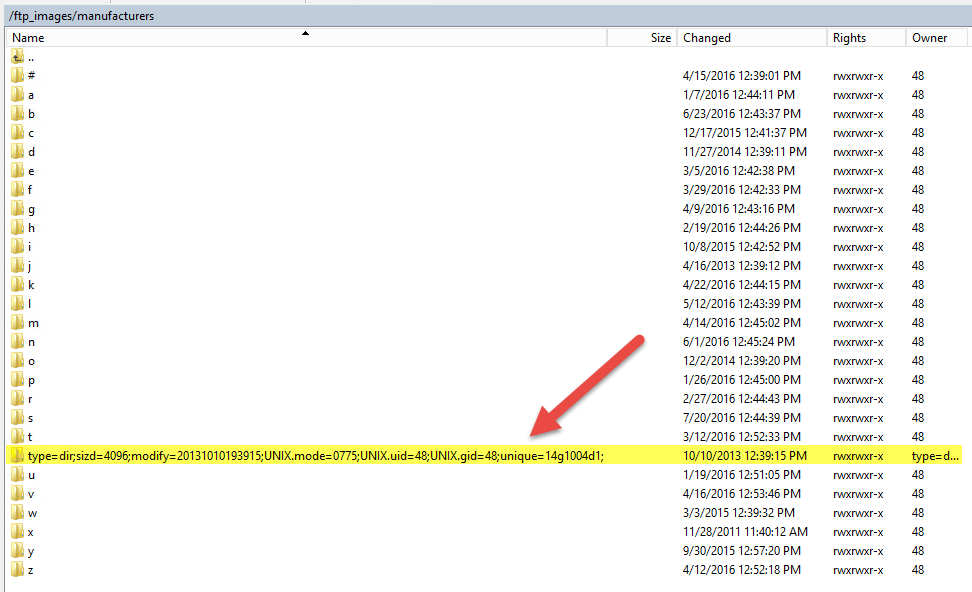 Error listing directory '/ftp_images/manufacturers/type=dir;sizd=4096;modify=20131010193915;UNIX.mode=0775;UNIX.uid=48;UNIX.gid=48;unique=14g1004d1;'.
