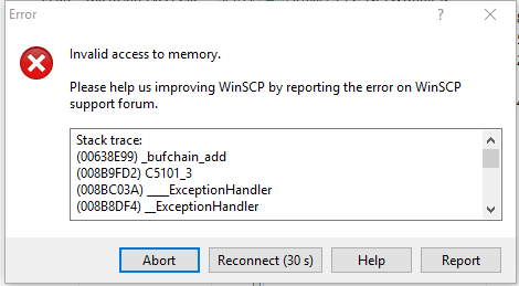 5. It will try to reconnect several times and a couple of different error messages can appear (always related to 'invalid access to memory')- pictures 2 and 3.