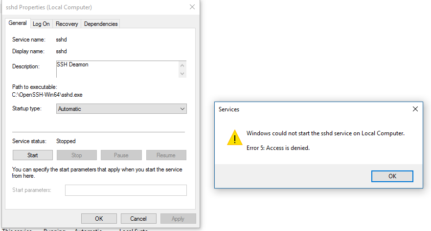 Windows could not start the sshd service on Local Computer. Error 5: Access Denied