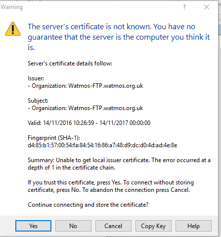 . 2016-11-15 09:21:54.557 Certificate common name "Watmos-FTP.watmos.org.uk" matches hostname