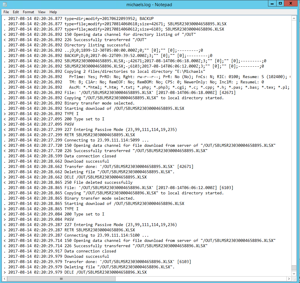We connect to an FTP and download 2 excel files a day. One file is fine but always the other became corrupted. I can see on the logs the file size before and after the transfer and are the same; however when you go to the directory the file size is considerably smaller. No errors are reported on the logs. I tried other scripting tool and it download the files with no issues. We have several scripts on Winscp and this only happens on this excel files. I attached a screenshot of the logs;