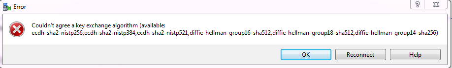 When attempting to login to an established session, connection can not be established and error message pops up. Typically when I hit the Login button from the home page, it loads another screen where a connection is established and a password must be entered. I do not have the ability to enter a password because I get the error message during the connection phase. The error message that pops up reads: "Couldn't agree a key exchange algorithm (available: ecdh-sha2-nistp256,ecdh-sha2-nistp384,ecdh-sha2-nistp521,diffie-hellman-group16-sha512,diffie-hellman-group18-sha512,diffie-hellman-group14-sha256)"