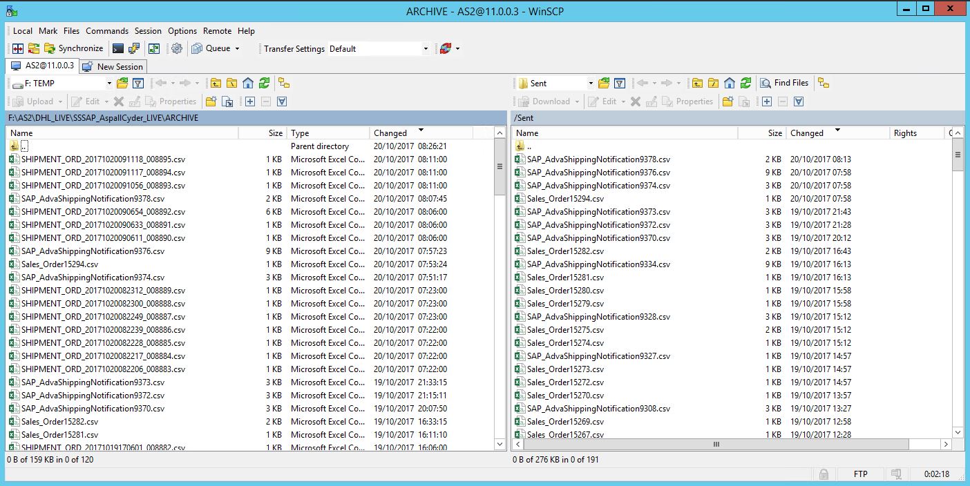I'm running a script every 15mins to pull down files from another server. What I'm finding is WinSCP is not pulling down all the files, it seems that the seconds are not displayed in the remote panel. For instance today a file was created 11.53am and 59 seconds, WinSCP ran at 11.53am and 56 seconds, then ran again at 12.08am and 56 seconds. The problem is it only sees the remote file as 11.53 as below and ignores copying the file.