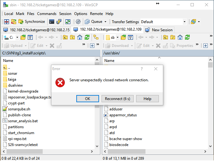 In the actual world, WinSCP will not allow you to interact with any part of it except for two buttons: "Reconnect" and "Ok". "Reconnect" will continue to fail, and basically keep you stuck in the same loop. "Ok" will close the session tab, close all the internal editor windows opened from that session, and basically cause you to lose any unsaved edits. It will also switch to another tab, which, if it also has connection issues, will re-pop the reconnection window without even redrawing the window in the background or actually telling you which session it belongs to.