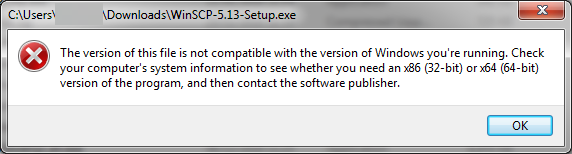 "The version of this file is not compatible with the version of Windows you're running. Check your computer's system information to see whether you need an x86 (32-bit) or x64 (64-bit) version of the program, and then contact the publisher."