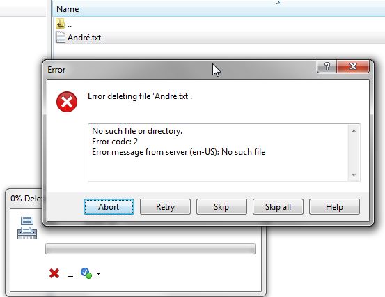 When using special characters (e.g. French 'é' or German Umlaute 'ä') in filenames in SFTP mode, then the filename is shown correctly in WinSCP but you cannot access the file (delete, open etc.). You see the file but when try deleting it the following error message is shown (see also attachment):