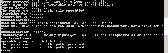 I have to automate file transfer from NAS path location to unix server. Have been using below code but its throwing error as mentioned below (Also not able to find the winscp.log file in my system, can it work without that, if not what can be the alternative approach):