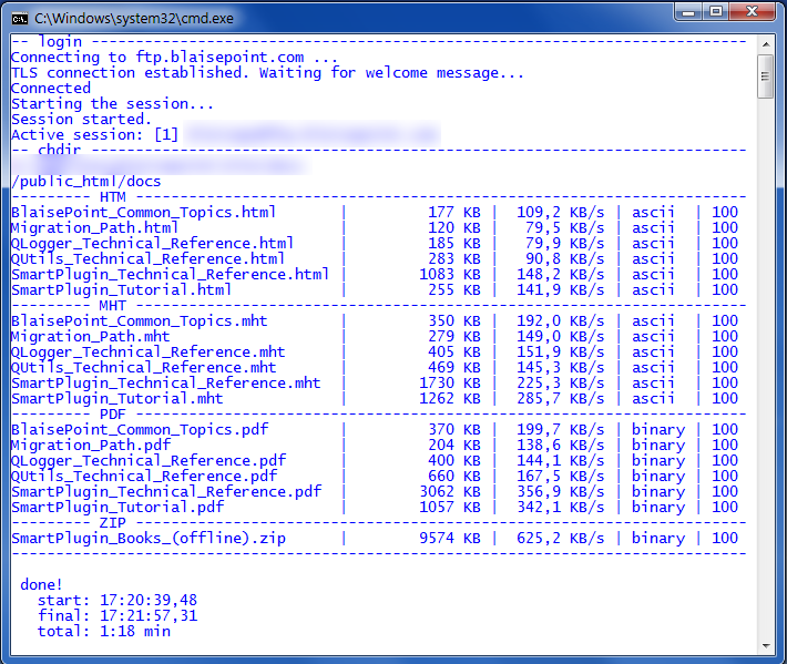 I'm using the command line tool for uploading my software documentation (html, mht, pdf and zip files). It turns out that the filenames of my docs are wider than those 25 characters the WinScp window allocates for the filename column. As a result, the filenames are being truncated after the 25th char.
