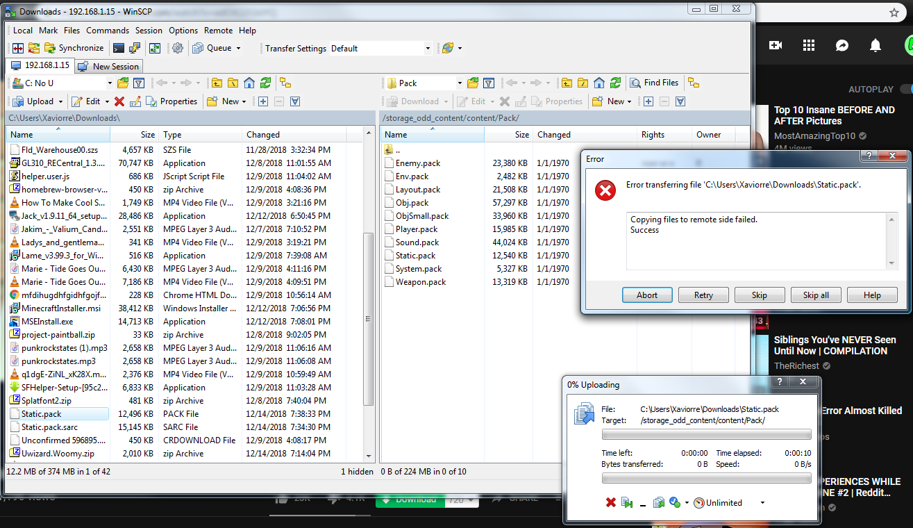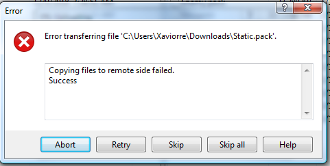 I'm using WinSCP 5.13.6 Build 9061 on Windows 7 Pro. The protocol is FTP and interface is GUI Commander. Attached are some images of the error. And here's the error text: "Copying files to remote side failed. Success". I am transferring a file called "Static.pack" to my modded Wii U with FTPIIU_Everywhere. I dragged the file into the server and got the error. I have the log as an attachment.