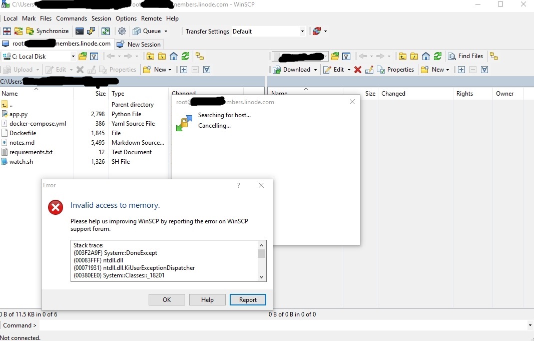 After a minute or so, I clicked in the WinSCP dialog that had popped up, I clicked something like "OK" to acknowledge to WinSCP had lost the connection. Then it popped with a crash.