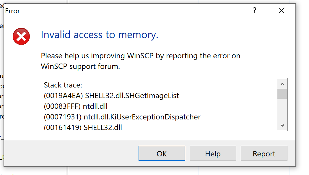Stack trace: (0019A4EA) SHELL32.dll.SHGetImageList (00083FFF) ntdll.dll (00071931) ntdll.dll.KiUserExceptionDispatcher (00161419) SHELL32.dll (001616CC) SHELL32.dll (0018CF32) SHELL32.dll.SHGetFileInfoW (0043BFFE) Iedriveinfo::TDriveInfo::ReadDriveStatus (0001E2C1) TCustomScpExplorerForm::DDExtInitDrag (0001DED7) TCustomScpExplorerForm::RemoteFileControlDDCreateDragFileList (00420EB8) Customdirview::TCustomDirView::DDDragDetect (0067CB42) TUnixDirView::DDDragDetect (0041D93C) Customdirview::TCustomDirView::CNNotify (0025720D) Vcl::Controls::TControl::WndProc (0025BD51) Vcl::Controls::TWinControl::WndProc (0029FC7F) Vcl::Comctrls::TCustomListView::WndProc (0025BEB7) Vcl::Controls::_17076 (0025BD51) Vcl::Controls::TWinControl::WndProc (0025B398) Vcl::Controls::TWinControl::MainWndProc (0038109C) System::Classes::_18201 (00045359) USER32.dll (00036297) USER32.dll (00035E35) USER32.dll (000427ED) USER32.dll (000718EB) ntdll.dll.KiUserCallbackDispatcher (0003570E) USER32.dll.SendMessageW (00054B61) COMCTL32.dll (0019E597) COMCTL32.dll (0019EE99) COMCTL32.dll (00094E53) COMCTL32.dll (0005C002) COMCTL32.dll (00045359) USER32.dll (00036297) USER32.dll (000357EA) USER32.dll.CallWindowProcW (0025BE62) Vcl::Controls::TWinControl::DefaultHandler (0041F16E) Customdirview::TCustomDirView::WMLButtonDown (0025BD51) Vcl::Controls::TWinControl::WndProc (0029FC7F) Vcl::Comctrls::TCustomListView::WndProc (0038109C) System::Classes::_18201 (00045359) USER32.dll (00036297) USER32.dll (000357EA) USER32.dll.CallWindowProcW (0007430F) COMCTL32.dll (000743AE) COMCTL32.dll (000740AC) COMCTL32.dll (00045359) USER32.dll (00036297) USER32.dll (000357EA) USER32.dll.CallWindowProcW (00443FF7) Dragdrop::TDragDrop::WndMethod (0038109C) System::Classes::_18201 (00045359) USER32.dll (00036297) USER32.dll (000353D6) USER32.dll (000351AB) USER32.dll.DispatchMessageW