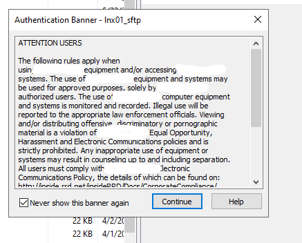 When logging in to a remote server via sftp. The Authentication Banner shows even after the option "Never show this banner again" is checked. This occurrence is repeatable.