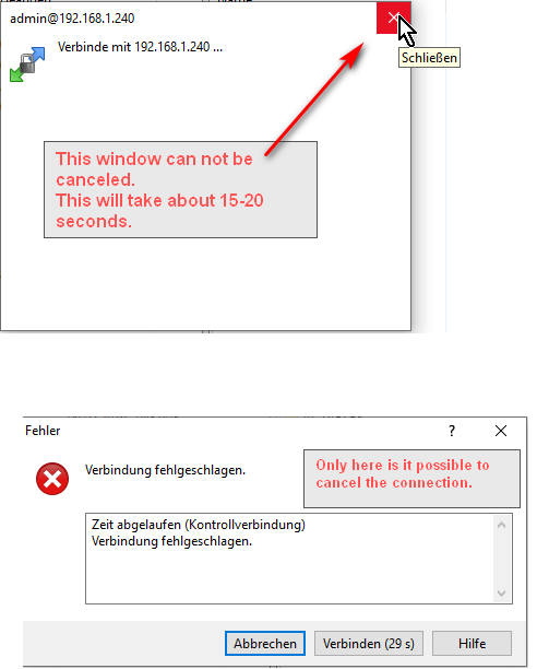 Ich muss daher jedes mal etwa 15-20 Sekunden warten, bis WinSCP die Fehlermeldung "Verbindung fehlgeschlagen" anzeigt, erst dann kann ich die "Abbrechen Funktion" nutzen.