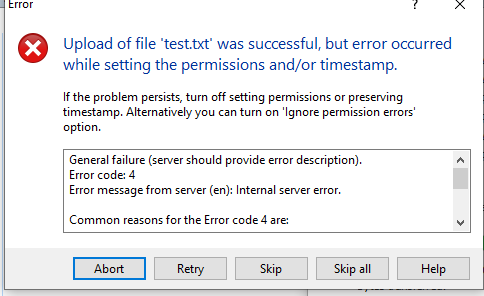 We are using WinSCP from long-time and didn't find any issue to access SFTP but suddenly from last 2-3 days we are getting error of Permissions and/or timestamp while uploading the file.Please let us know if any new feature is added to the application or it's a bug.