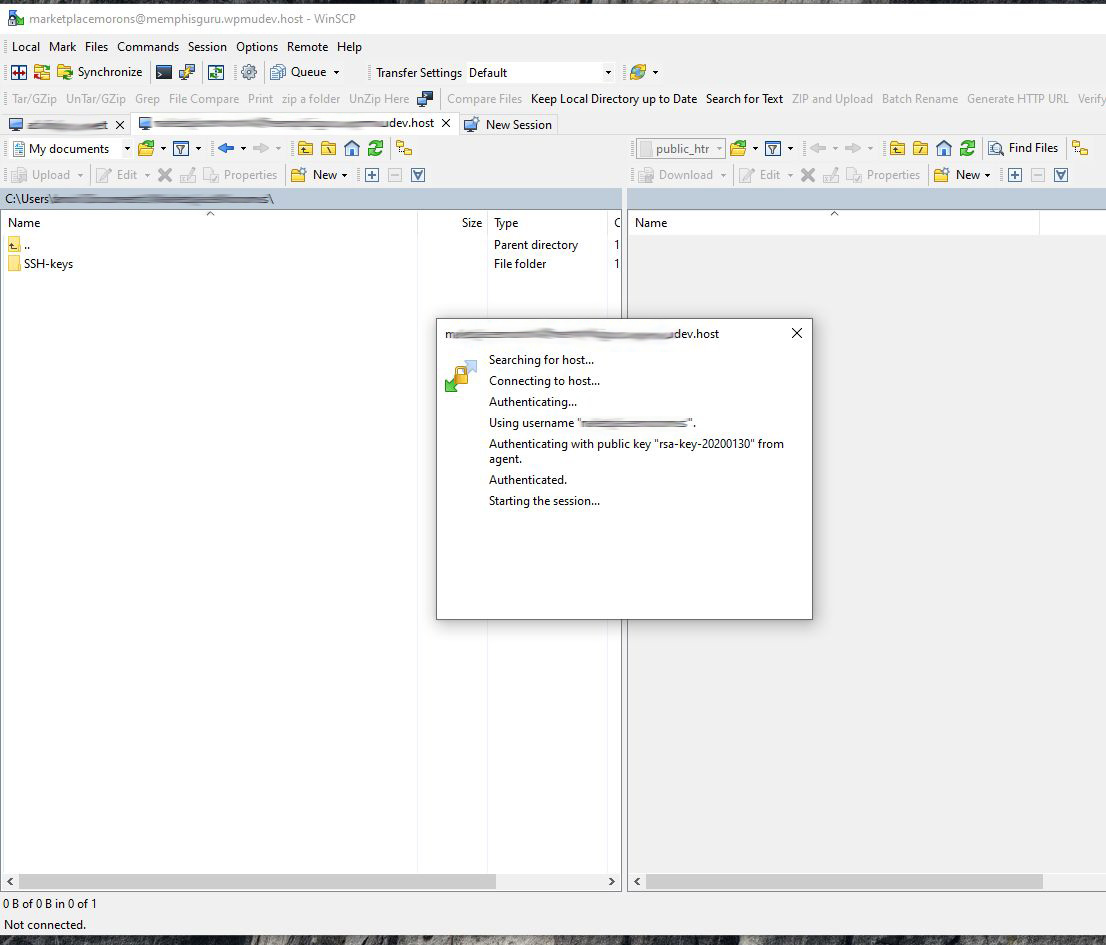 When I tried to connect with WinSCP I get a successful connection message "authenticated" but the connection never completes and displays server files.