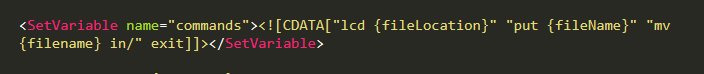 <ExecuteFile target="C:\Program Files (x86)\WinSCP\winscp.com" parameters='/command "open sftp://{connectionCredentials} -hostkey=""{hostKey}""" {commands}'/>