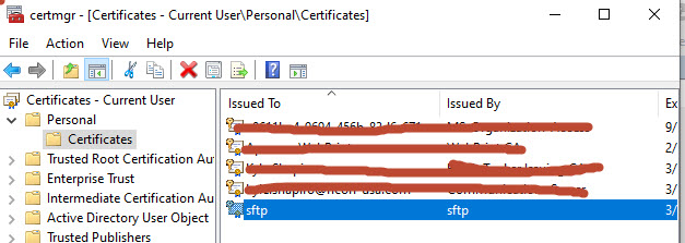 Now here's the problem.. I am trying to use FTPs (TLS/SSL Explicit) but unable to connect. I have created a Self Signed certificate, configured my FTP site to use the certificate, and I have also imported that self signed certificate on my local PC in the automatically selected cert store. I have also placed it in personal store locally. This was exported from my FTP server as a PFX file. I have also turned off the windows firewall on the FTP server for the sake of troubleshooting.