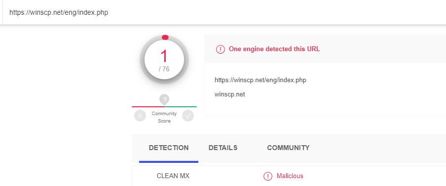 WinSCP root website tagged as Malware: clean mx