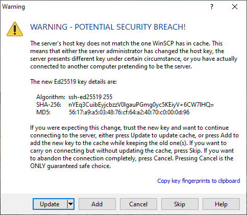 Since yesterday, I keep getting a prompt saying that my server fingerprint has changed. I click "Add" but the prompt keeps reappearing. Ultraseedbox say the fingerprint hasn't changed since June 2020, when they last performed a server reinstall.