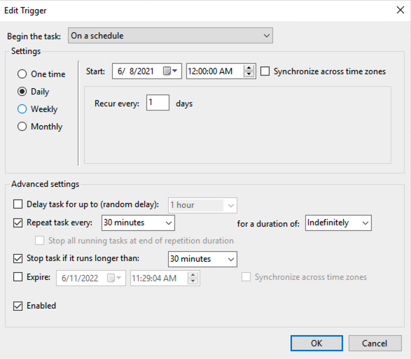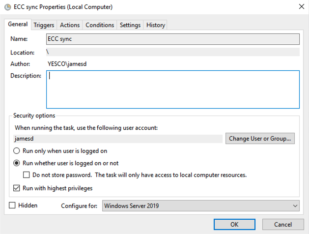 I need windows task scheduler to run the sync bat file I have created when I am not logged into the server. This is on a Windows 2019 Server. Any tips on what I may have setup wrong. Here are some screenshots.