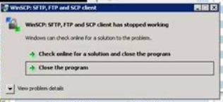 We have installed WinSCP Version 5.1.2 (Build 2816) (OS 6.1.7601 Service Pack 1) on our Windows Server 2008 R2. WinSCP is configured to be invoked for export function from within our client application. So when the User tries to click on export option we are getting "WinSCP: SFTP, FTP and SCP client has stopped working". Could you please advise what could be the possible reasons for the failure?.