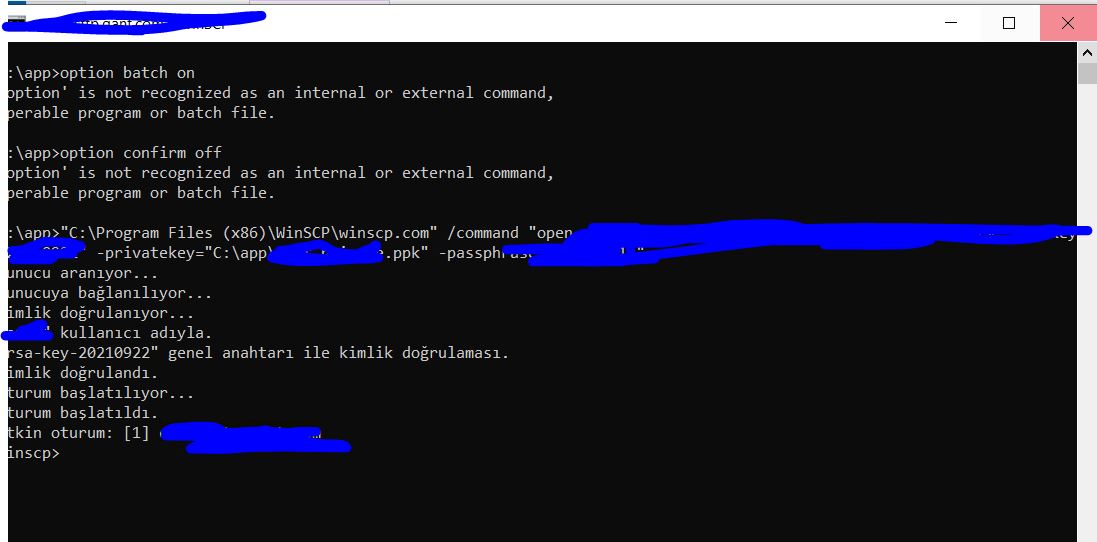 option batch on option confirm off "C:\Program Files (x86)\WinSCP\winscp.com" /command "open sftp://xxx:xxxx@sftp.xxx.com:22 -hostkey="rsa-key-20210922" -privatekey="C:\app\xxx_private.ppk" -passphrase="xxxxx"" option transfer binary cd /simple/millnet/xxx put "C:\app\deneme.txt" close exit