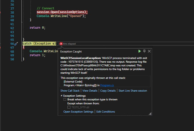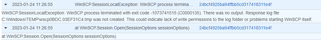 System.Exception: Unable to connect FTP location , WinSCP.SessionLocalException: WinSCP process terminated with exit code -1073741515 (C0000135). There was no output. Response log file C:\Windows\Temp\wscp660C.001DC84D.tmp was not created. This could indicate lack of write permissions to the log folder or problems starting WinSCP itself. at WinSCP.Session.Open(SessionOptions sessionOptions) at