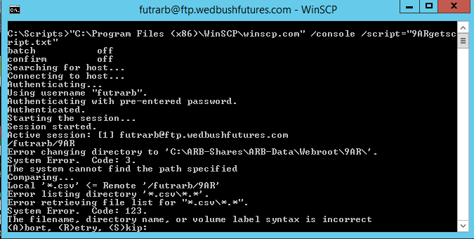 # Automatically answer all prompts negatively not to stall # the script on errors option batch off # Disable overwrite confirmations that conflict with the previous option confirm off open usr:pass@ftp.domain.com # If you need to change directory eg..(cd /cme/ftp/940/Outgoing) cd /futr/9AR lcd "C:\Shares\Data\W\9AR\" synchronize local -preservetime *.csv synchronize local -filemask="*>=1D" c:\hares\Data\W\9AR\* synchronize local "C:\Shares\Data\W\9AR\" "/futr" Disconnect close exit