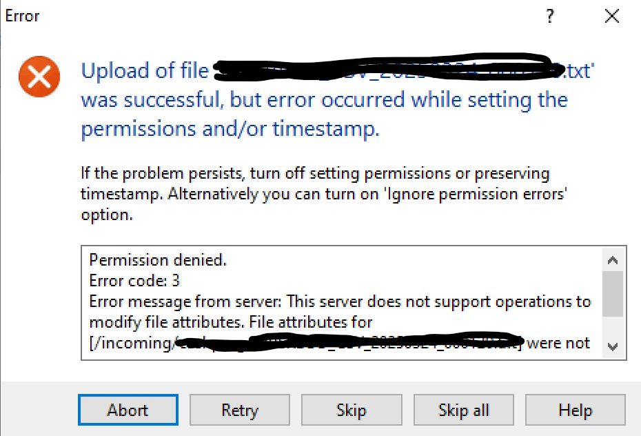 Upload of file was successful but error occured while setting the permissions and/or timestamp. Permission Denied Error Code: 3