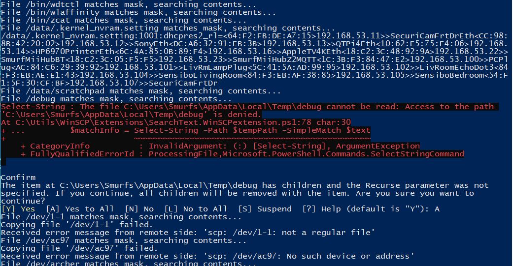 File /data/boot_state_0 matches mask, searching contents... File /data/scratchpad matches mask, searching contents... File /debug matches mask, searching contents... Select-String : The file C:\Users\XXXXXXX\AppData\Local\Temp\debug cannot be read: Access to the path 'C:\Users\XXXXXXX\AppData\Local\Temp\debug' is denied. At C:\Utils\WinSCP\Extensions\SearchText.WinSCPextension.ps1:78 char:30 + ... $matchInfo = Select-String -Path $tempPath -SimpleMatch $text + ~~~~~~~~~~~~~~~~~~~~~~~~~~~~~~~~~~~~~~~~~~~~~~~~ + CategoryInfo : InvalidArgument: (:) [Select-String], ArgumentException + FullyQualifiedErrorId : ProcessingFile,Microsoft.PowerShell.Commands.SelectStringCommand Confirm The item at C:\Users\XXXXXXX\AppData\Local\Temp\debug has children and the Recurse parameter was not specified. If you continue, all children will be removed with the item. Are you sure you want to continue? [Y] Yes [A] Yes to All [N] No [L] No to All [S] Suspend [?] Help (default is "Y"):